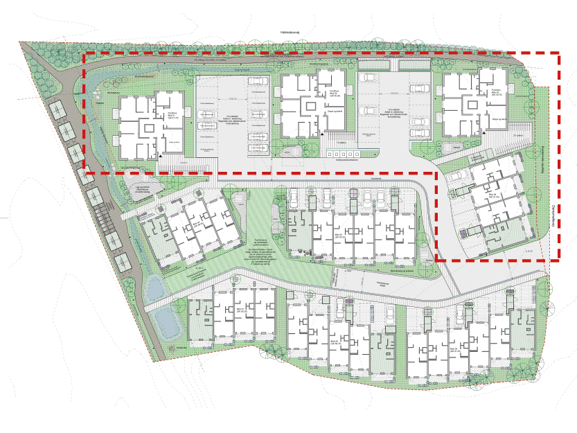 Afdelingen kommer til at består af tre punkthuse i fire etager med elevator og tilgængelighedsboliger i ét plan samt fire rækkehuse.